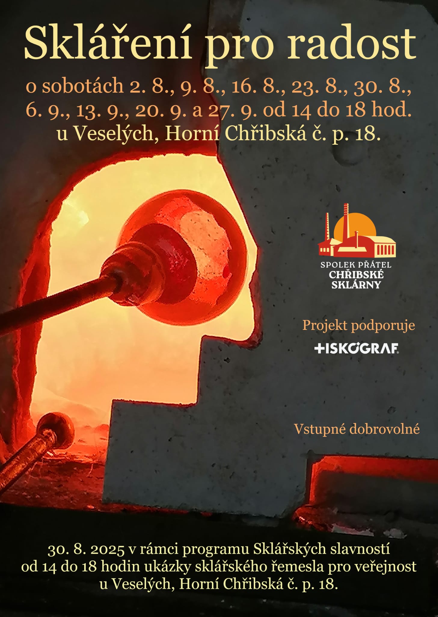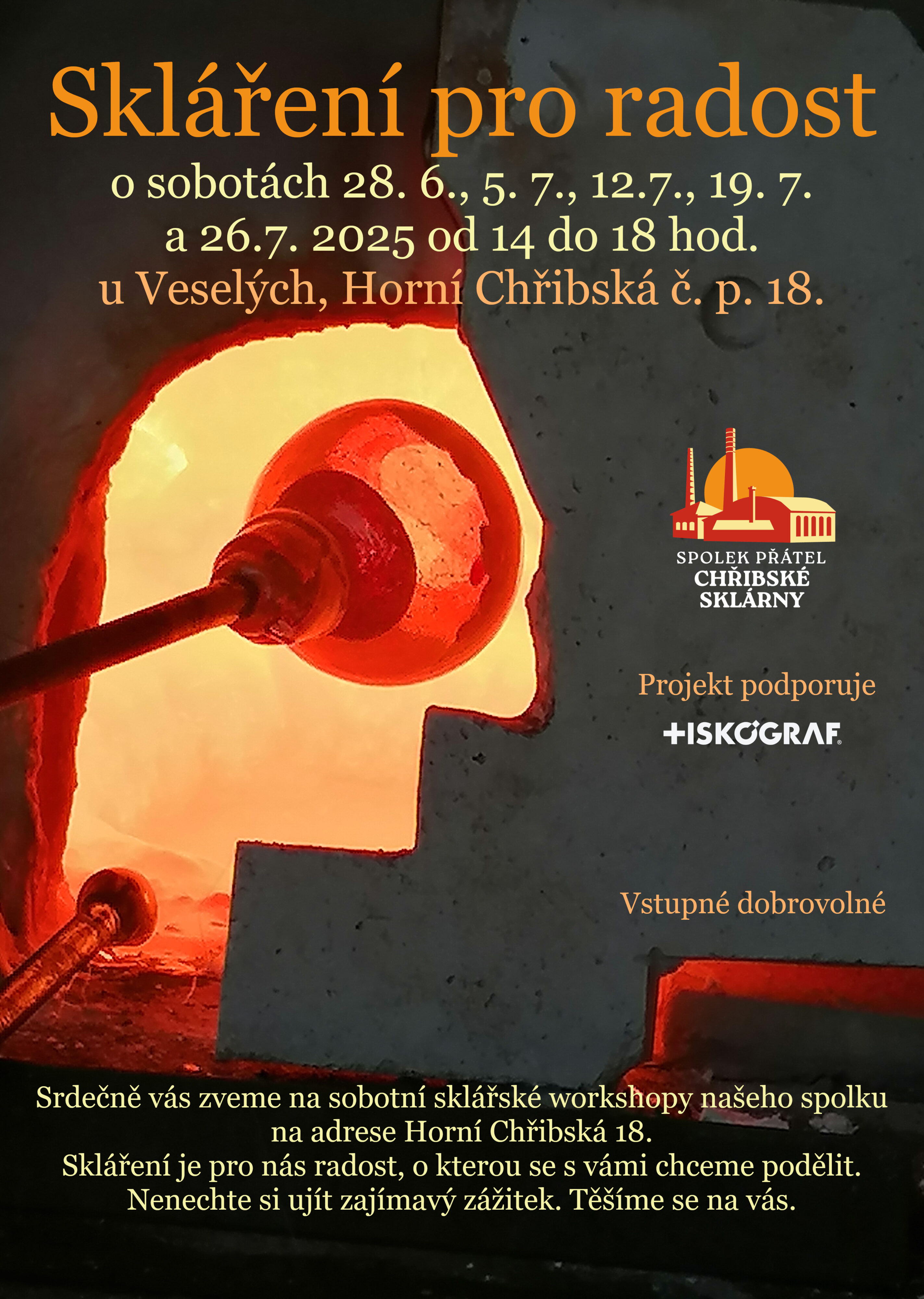 SPOLEK PŘÁTEL CHŘIBSKÉ SKLÁRNY z. s. zahájil 30. května 2025 svůj první projekt s názvem „Skláření pro radost“. Jedná se o malé sklářské workshopy pro veřejnost, které jsou určeny všem, kdo se zajímají o tradiční ruční výrobu hutního skla a chtěli by se s ní naživo seznámit prostřednictvím sledování společného skláření členů našeho spolku – zkušených sklářů ze Chřibské a okolí. Skláření je pro nás radost a o tu čistou radost se s vámi chceme podělit a předávat ji dál. „Skláření pro radost“ se bude letos konat vždy o sobotách